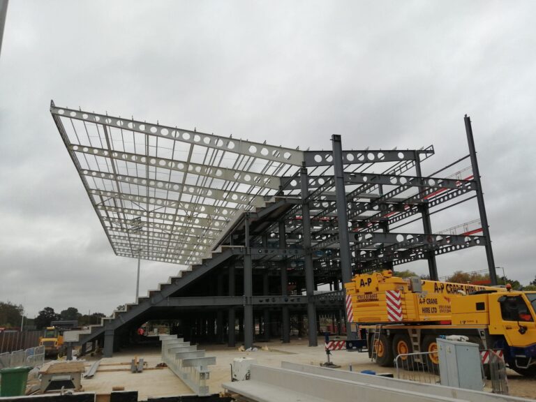 Steel was the preferred material for the new grandstand as it lends itself to large spans required for the exhibition centre as well as the cantilever roof. For the main grandstand, Billington Structures erected approximately 1,500 tonnes of structural steelwork, which predominantly consisted of column and beams, supporting metal decked floors and pre-cast concrete slabs for the terracing. All exposed steelwork was also pre-painted which contributed to overall speed of the construction process. The new grandstand is 110m long with a maximum height of 28m and topped with a 18m cantilever roof.