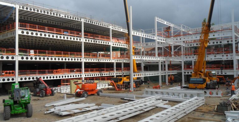 The steel frame of the building has a regimented design, except on the four uppermost floors that incorporate steps to create terraces along Oxford Street and Wells Street. The fabricated cellular beams that will accommodate the building’s services within their depth are used throughout the project. The beams and columns will all be left exposed to create an industrial-looking office environment.